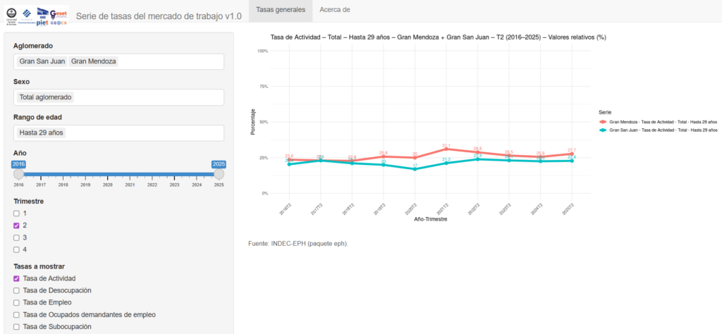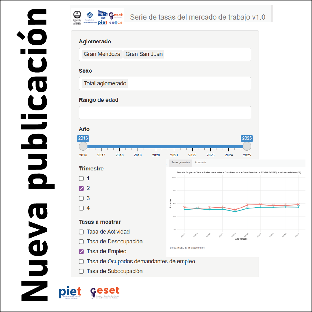 Desde el Grupo de Estudios sobre Sindicatos, Empresas y Trabajo (GESET–PIET) y el Grupo de Estudios sobre R aplicado a las Ciencias Sociales nos complace presentar la aplicación interactiva “Serie de tasas del mercado de trabajo (2016–2025)”, una herramienta desarrollada en R/Shiny que permite visualizar y explorar de manera dinámica los principales indicadores del mercado de trabajo urbano en Argentina a partir de datos de la Encuesta Permanente de Hogares (EPH).