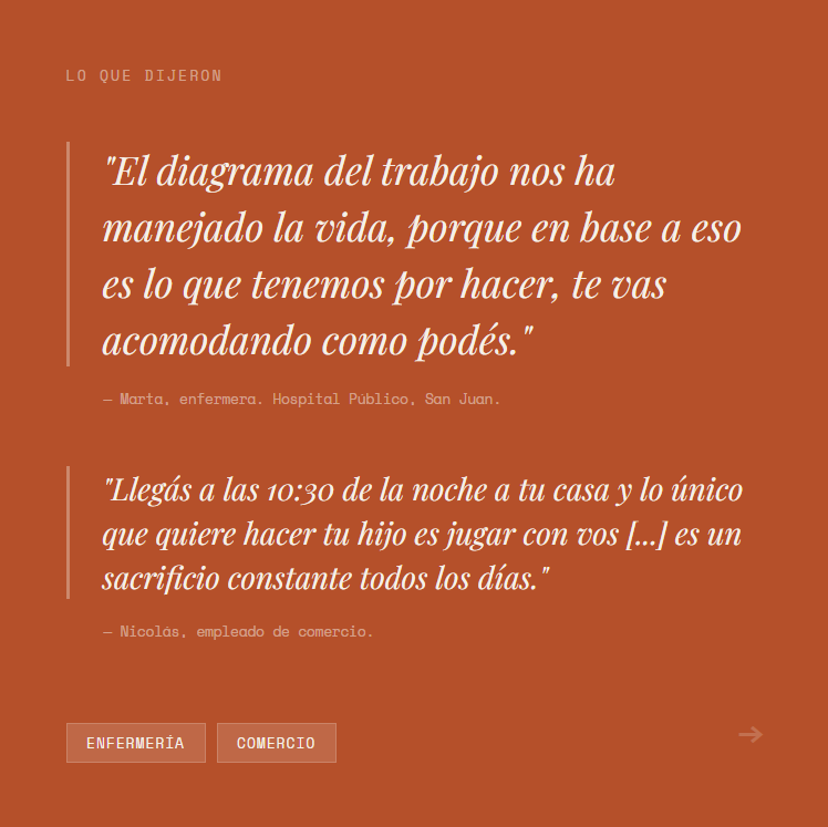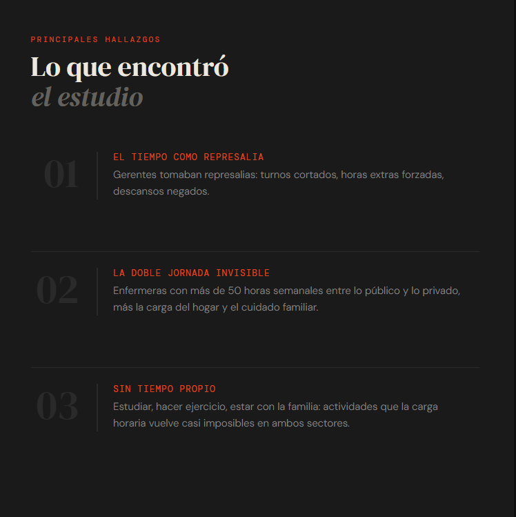 - Relatos de enfermeras trabajando más de 50 horas semanales entre dos hospitales, llegando a las 10 de la noche a encargarse de la familia y las tareas del hogar.