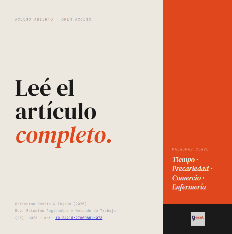 Ontiveros Dávila, M. B. y Tejada, C. del R. (2026). Desafíos en la conciliación del tiempo de trabajo y la vida personal en enfermería y comercio en 2023: un estudio exploratorio en el Gran San Juan. Revista de Estudios Regionales y Mercado de Trabajo, (23),